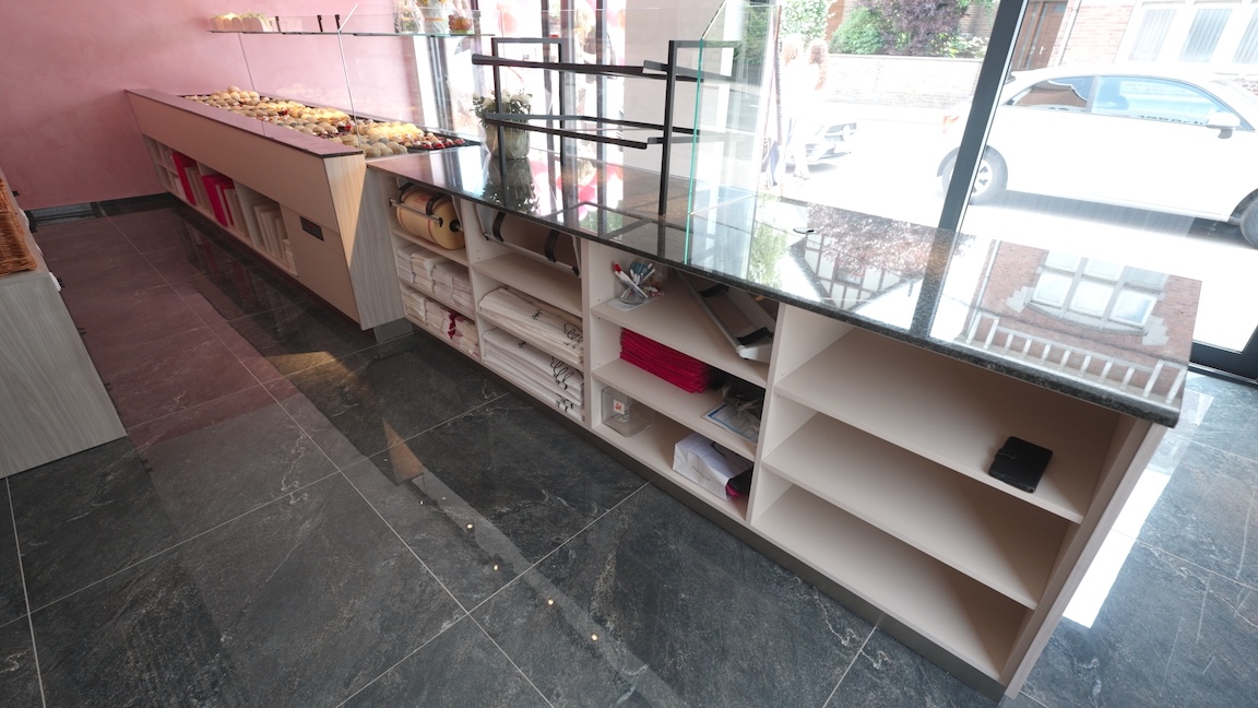 La pièce maîtresse est un comptoir frigorifié entièrement pensé et produit dans nos ateliers. Nous avons conçu un bac frigo spécifique pour répondre aux contraintes de froid et d'humidité, en utilisant des matériaux robustes et durables. Chaque détail a été intégré : de l'espace de présentation des produits aux rangements ergonomiques, en passant par l'ajustement du granit et des vitrages. Le résultat un comptoir frigorifique fonctionnel, ergonomique, sans buée sur les vitres et totalement sur mesure.