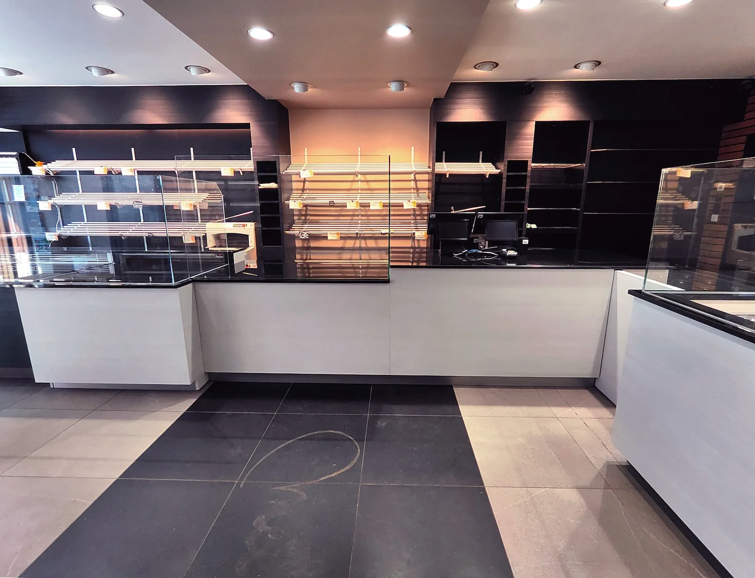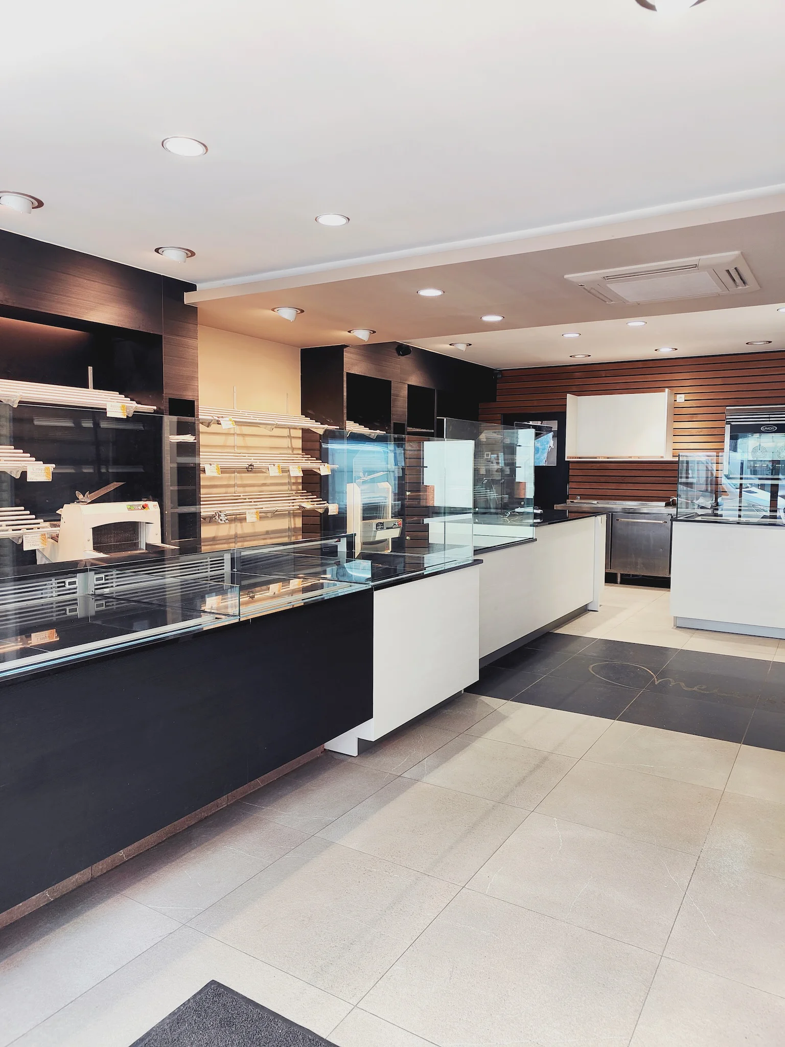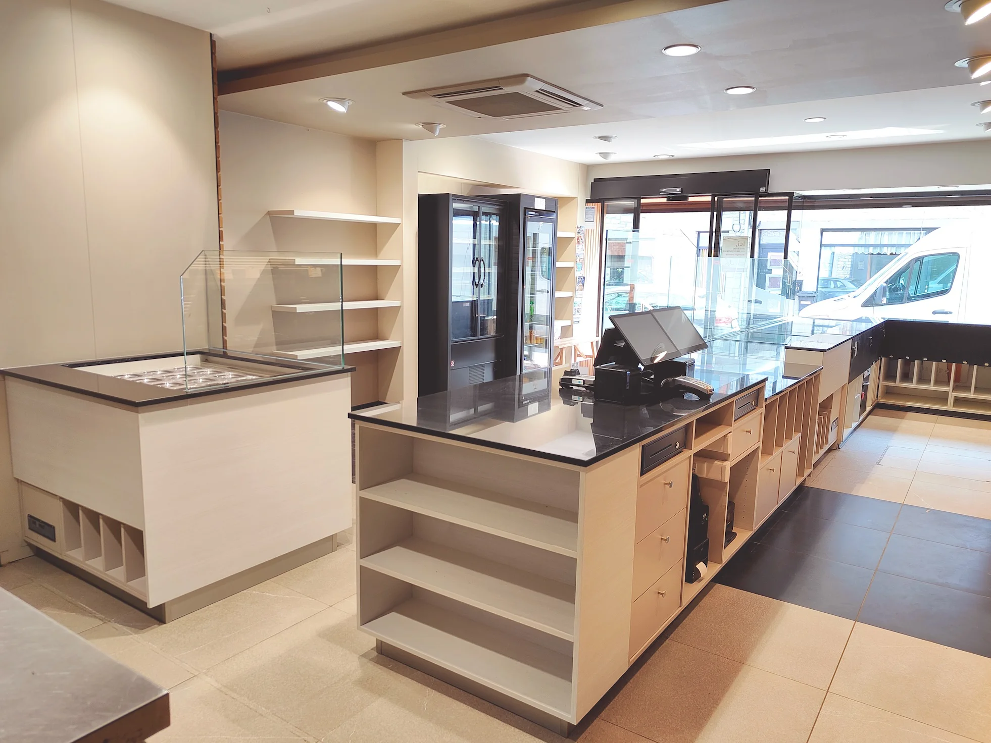 Notre intervention comprenait la réadaptation du comptoir existant, la création d’un nouveau comptoir frigorifique complémentaire, ainsi que l’aménagement des zones arrière-comptoir destinées au rangement et à la pose du pain.
