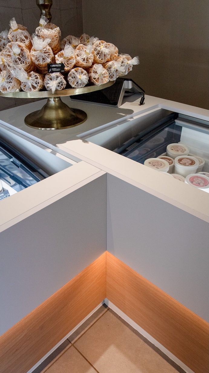 Ce projet est une démonstration de notre capacité à intégrer des contraintes techniques dans un design épuré. Le plan de travail principal, en Corian, a été usiné pour intégrer les bacs à toppings de manière hygiénique et fluide. Il dialogue avec un plan en quartz, choisi spécifiquement pour sa résistance à la chaleur de l'espace "moule à gaufre". Le comptoir, habillé d'un stratifié haute densité, allie durabilité et facilité d'entretien, des critères essentiels pour un commerce.