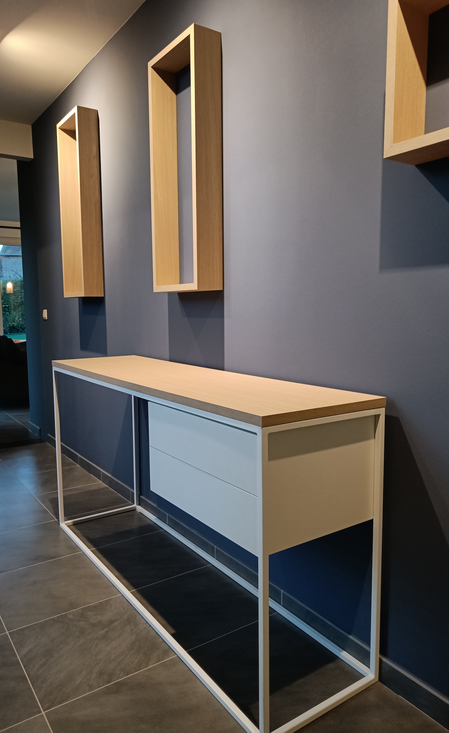 Pour finir, nous avons habillé le hall d'entrée d'un meuble et de niches sur mesure, créant un espace accueillant et personnel où la famille peut librement intégrer des éléments de décoration et se sentir "chez elle" dès le franchissement de la porte.