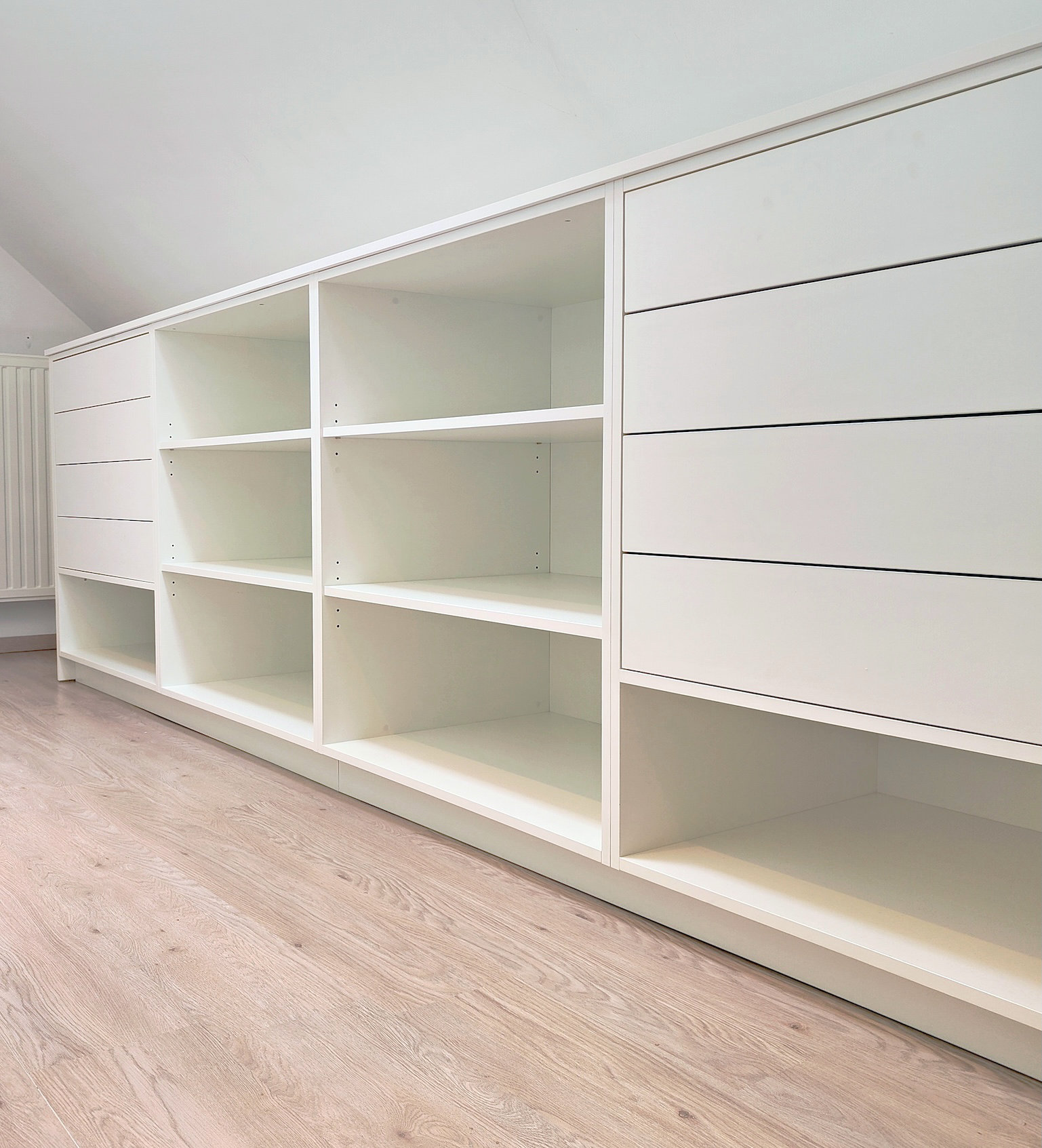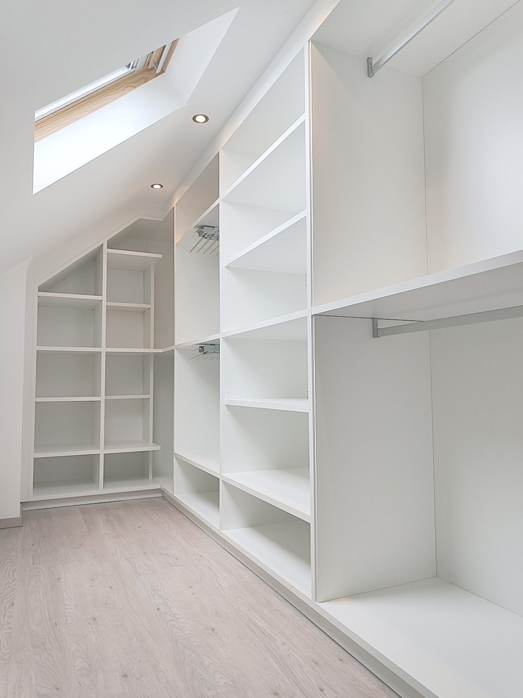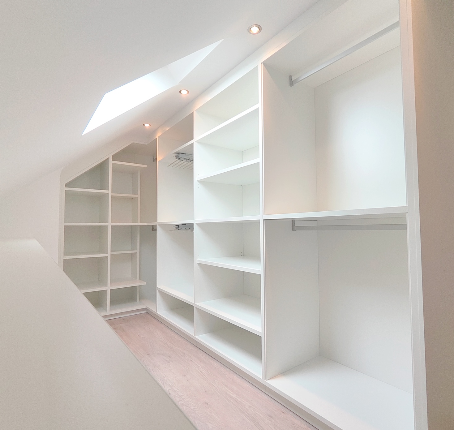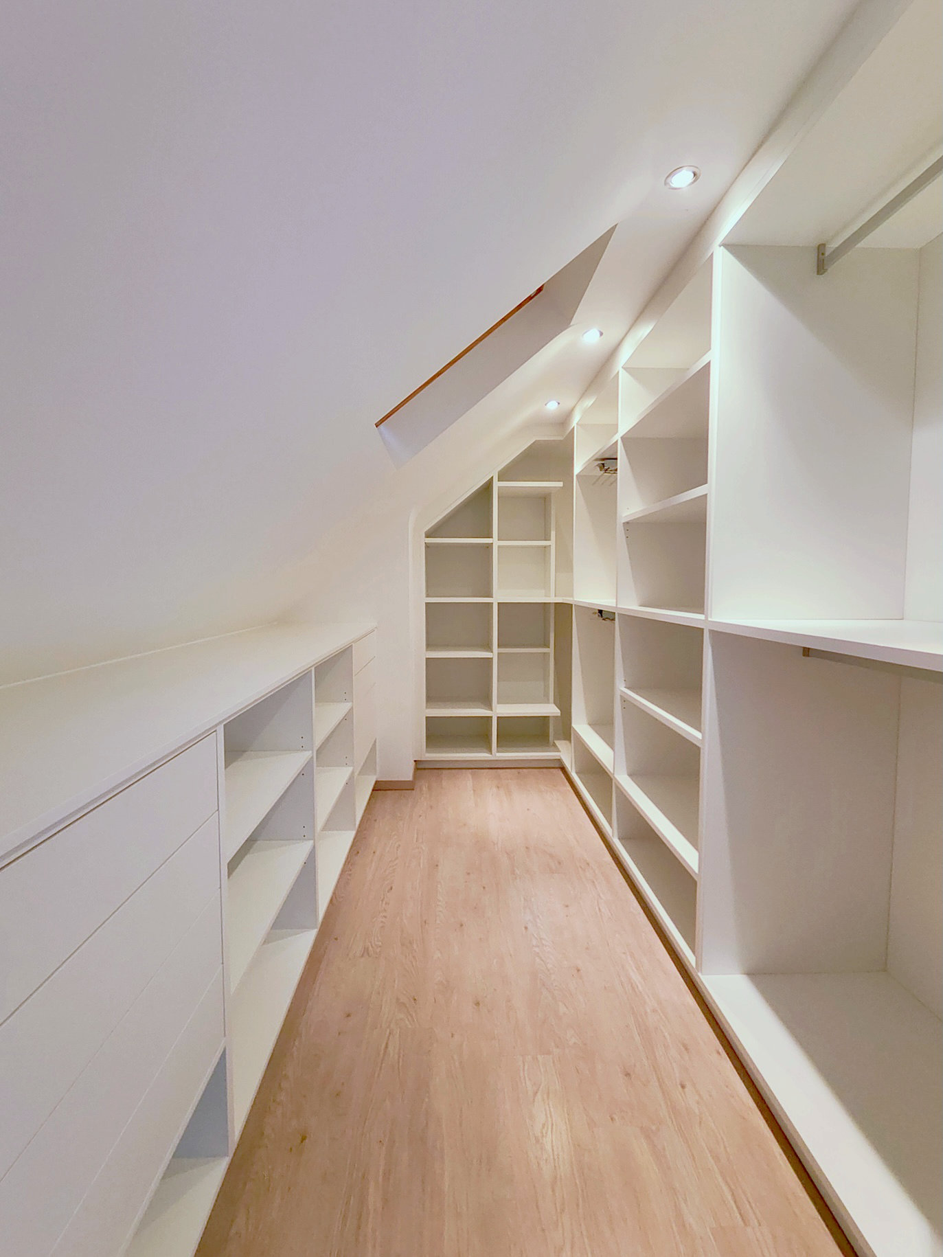 L'enjeu de ce projet n'était donc pas seulement d'ajouter des étagères, mais de transformer un volume complexe en un espace de rangement fluide, organisé, où chaque vêtement trouve naturellement sa place.