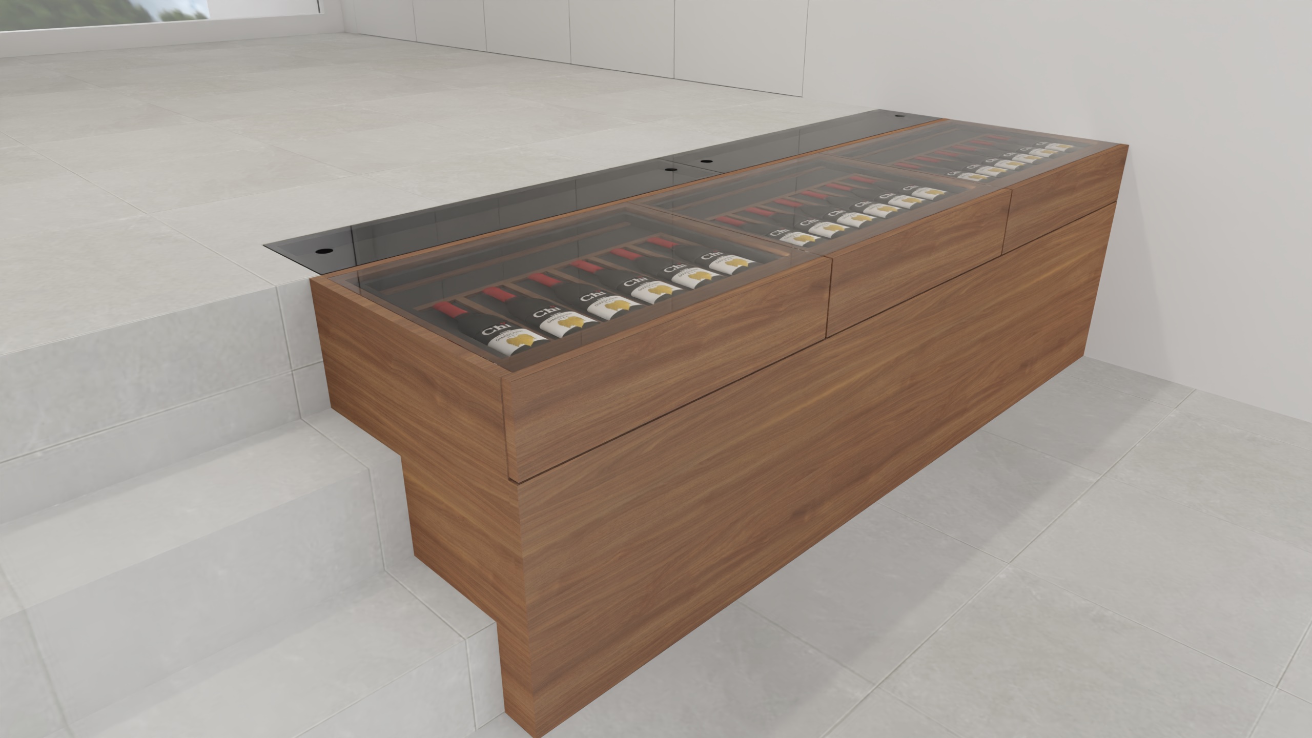 Le point de départ de ce projet était une contrainte technique complexe : masquer une différence de niveau entre le salon et la cuisine. Notre mission était de transformer ce défi en une opportunité, en créant une pièce de mobilier qui ne soit pas seulement fonctionnelle, mais qui devienne le véritable cœur de l'espace de vie, un lieu de convivialité et de partage autour du vin.